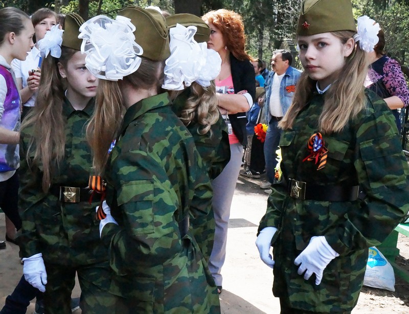 Несмотря на то, что митинг немного затянулся, настроение у собравшихся было по-настоящему праздничным. Многие принесли с собой самодельные транспаранты с военными фотографиями своих дедов и прадедов. Женщины и дети щеголяли в пилотках, военно-морских воротниках и прочих элементах военной формы — чтобы лишний раз подчеркнуть, по какому поводу здесь собрались. Большинство людей пришли с цветами. И практически у каждого на груди была георгиевская ленточка.